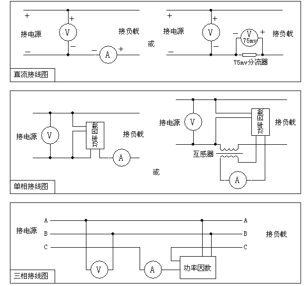 當(dāng)采集“三相”電參數(shù)時(shí),電壓傳感器輸入端連接至Uab;電流傳感器輸入端連接至Ic;功率因數(shù)傳感器輸入端連接至Uab、Ic。可采用互感器擴(kuò)大電流量程,互感器的連接方法同單相接線圖的互感器部分。